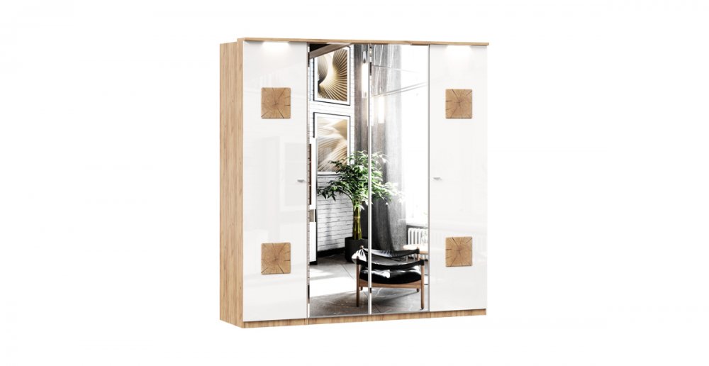 Шкаф 4Д К-21 комби с декоративными накладками BELLAGIO Дуб Золотой/Белый/Зеркало