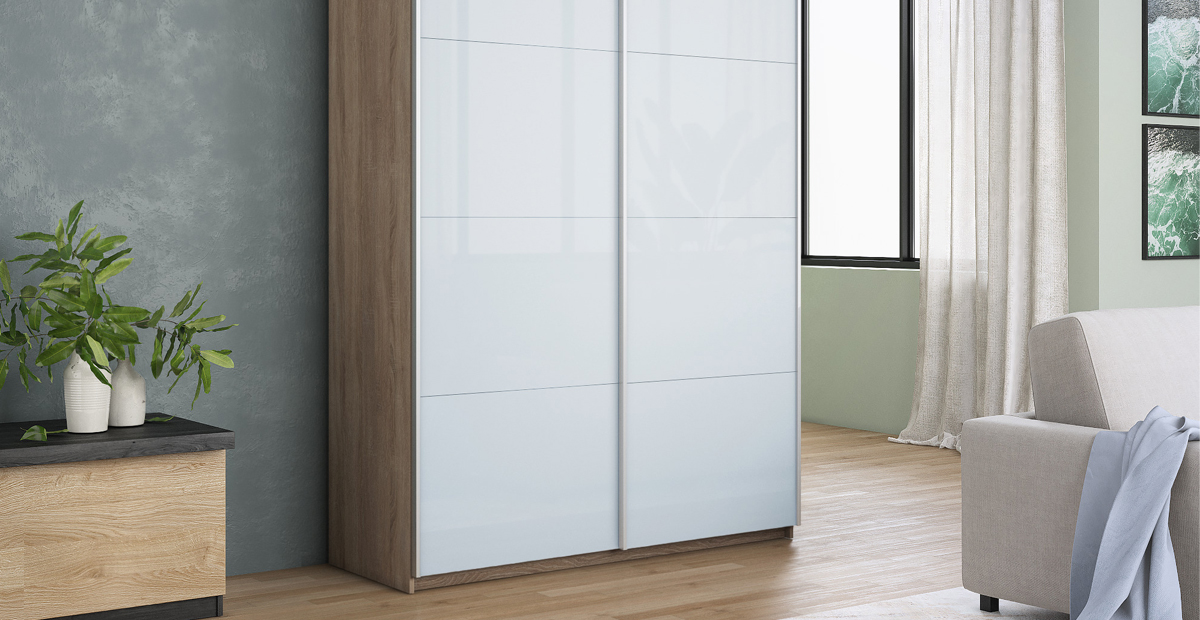 Глянцевое светлое стекло на фасаде шкафа сделает его образ легче и современнее.